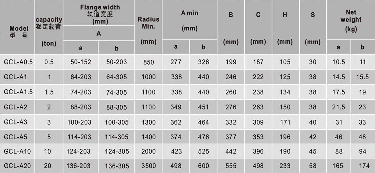 山東五牛GCL-A型 手拉單軌小車指標參數: